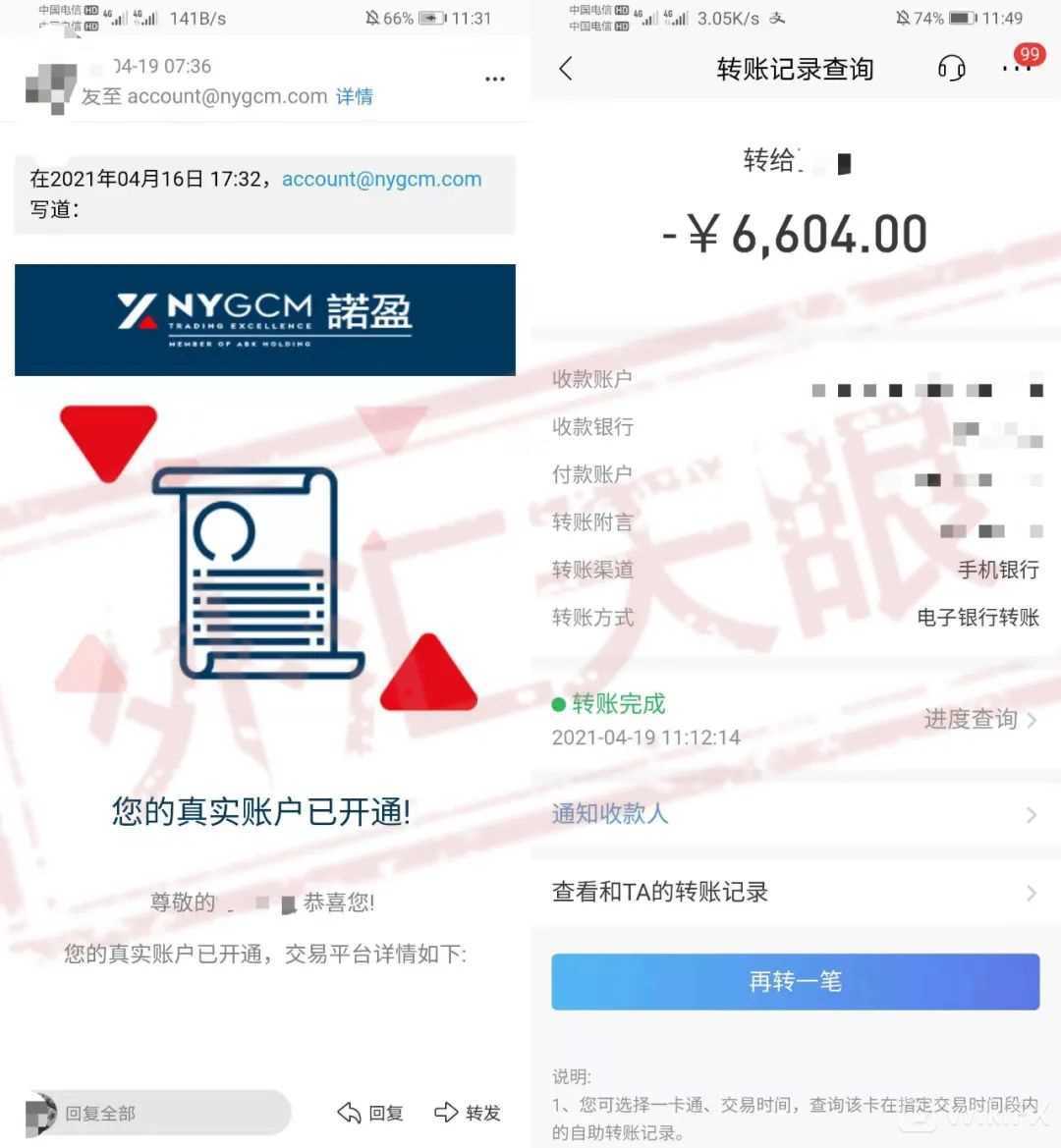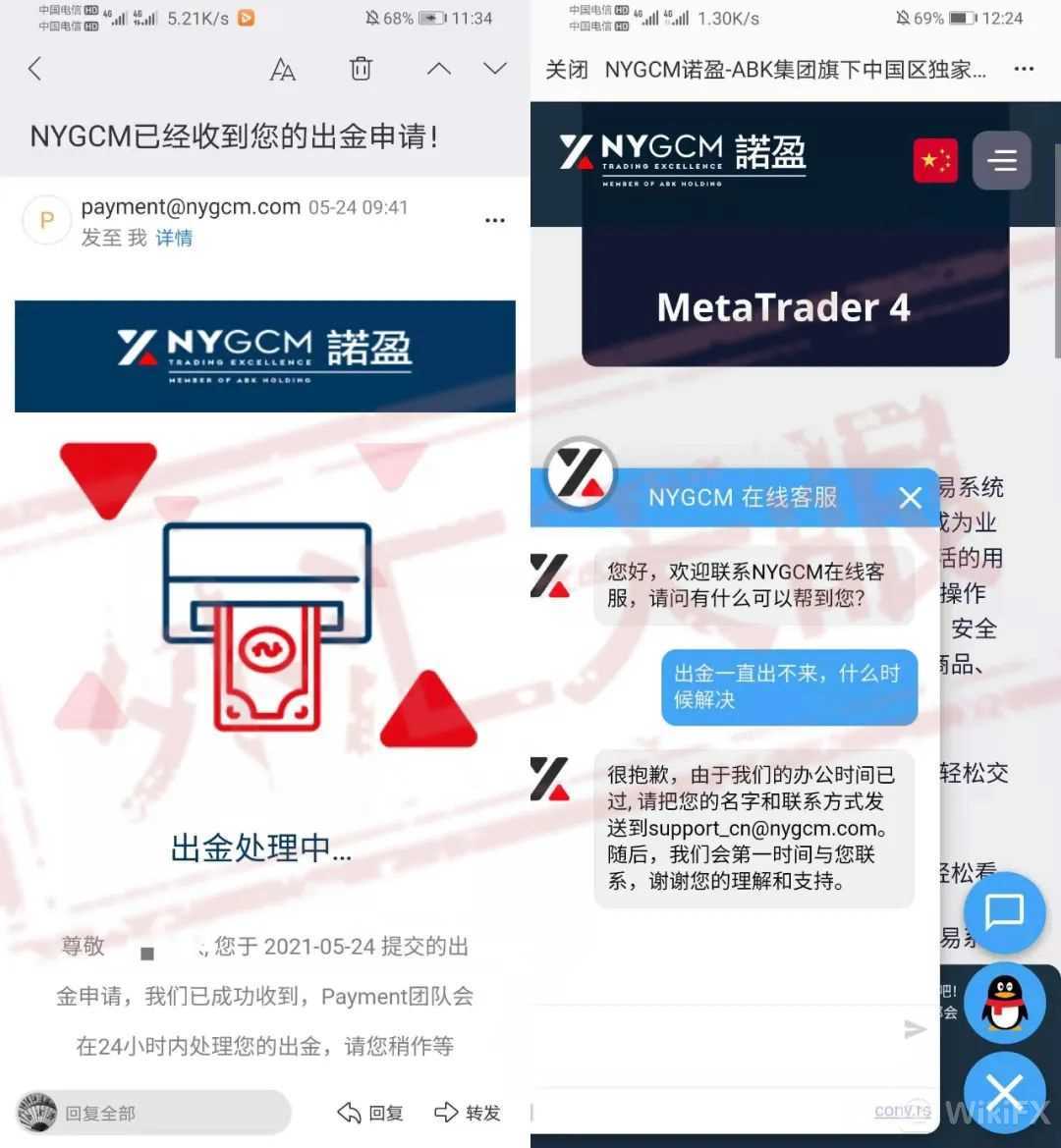 在5月14日,NYFX诺盈突然向用户发送了关于退出中国市场的邮件,内容为:根据母公司的最终决定,盈诺将在2021年5月21日起停止在中国市场的运营,请务必在截止期日前,关闭账户上所有的交易并提交出金申请,所有客户的出金将进行集中处理。