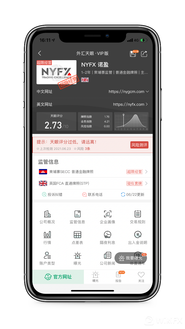 在外汇天眼上查询可知,NYFX诺盈天眼评分2.73分,宣称持有的两张监管牌照均已无效,柬埔寨SECC授权的普通金融牌照超限经营,英国FCA授权的直通牌照疑似套牌,目前曝光台中收到对该交易商的投诉曝光已经达到了十几条,内容均是严重的无法出金问题,存在巨大风险!