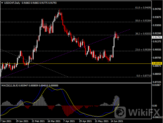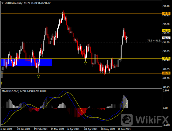 经历两日连跌后,美元指数自91中位水平企稳并录得反弹约0.3%,至91.76。隔夜,尽管Markit报告显示6月服务业PMI初值录得下滑至64.8(此前为70.4)并且表现不及市场预期的70.0,然而总体仍高于大流行前的平均值。此外,制造业PMI初值从上月的62.1录得上涨至62.6,超出市场预期的61.4的同时还续创历史新高。另外,美国第一季度经常帐录得减少1957亿美元,表现好于市场预期的减少2068亿美元。唯一美中不足的是,新屋销售录得两个月连跌至76.9万户,前值亦下修4.6万户至81.7万户。