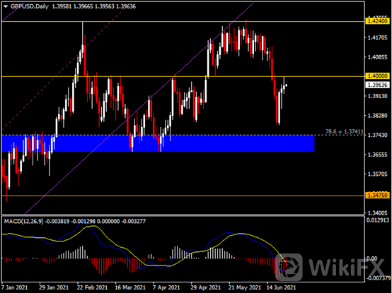 日线图显示英镑兑美元震荡上涨,当前仍承压于1.4000阻力。从MACD来看,快慢线呈拐向,红色动能柱逐渐收缩。汇价走势基本和动能柱的变化一致。