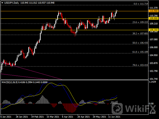日线图显示美元兑日元震荡上行,当前测试110.90区间阻力。从MACD来看,快慢线向上运行,白色动能柱温和增量。汇价走势基本和动能柱的变化一致。