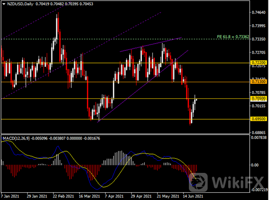 日线图显示纽元兑美元震荡上行,当前测试0.7050阻力。从MACD来看,快慢线呈拐向,红色动能柱温和收缩。汇价走势基本和动能柱的变化一致。