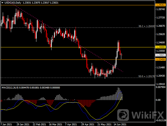 日线图显示美元兑加元触底回涨,当前收于1.2245区间支撑。从MACD来看,快慢线呈拐向,白色动能柱逐渐收缩。汇价走势和动能柱的变化稍有分歧。