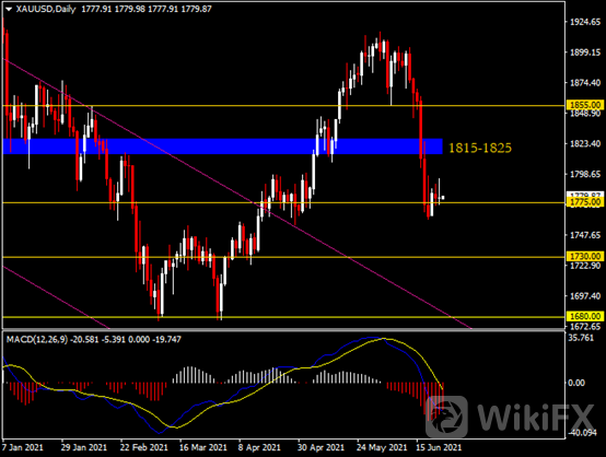 日线图显示金价于区间震荡,当前持稳于1775支撑。从MACD来看,快慢线向下扩张,红色动能柱则温和收缩。金价走势基本和动能柱的变化一致。