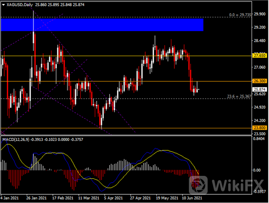 日线图显示银价小幅收涨,当前仍承压于26.30区间阻力。从MACD来看,快慢线向下扩张,红色动能柱则温和收缩。银价走势基本和动能柱的变化一致。