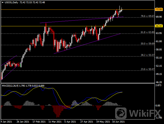 日线图显示油价温和上行,当前仍承压于72.50区间阻力。从MACD来看,快慢线欲形成死叉,白色动能柱逐渐收缩。油价走势和动能柱的变化稍呈分歧。