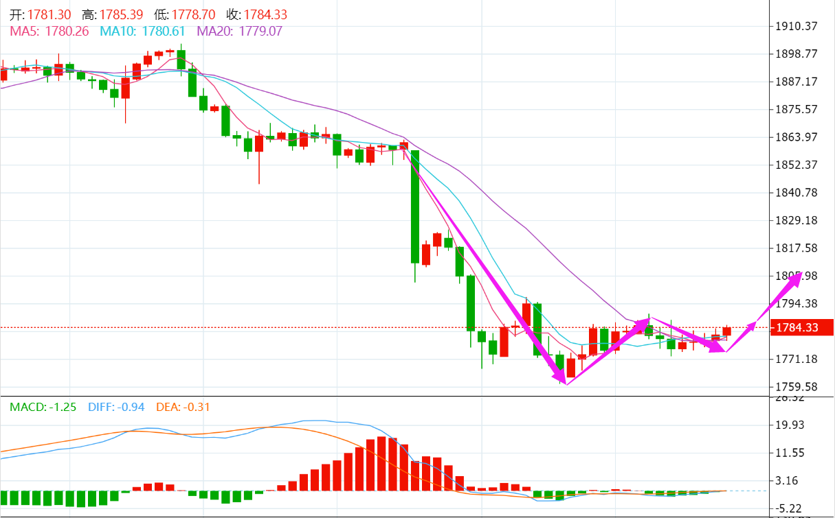 金价于1770关口上方企稳后逐步走高,下方低点上移至1780,下行动能减弱迹象明显,底部形态开始明确,MA均线止跌后上翘构成技术支撑,行情维持震荡筑底阶段,短线阻力在1788,突破后将打开上行空间,建议回调止跌后逢低做多。 稳重者:入场位1764-1772,止损1756,止盈1785。 激进者:入场位1771-1778,止损1762,止盈1789。