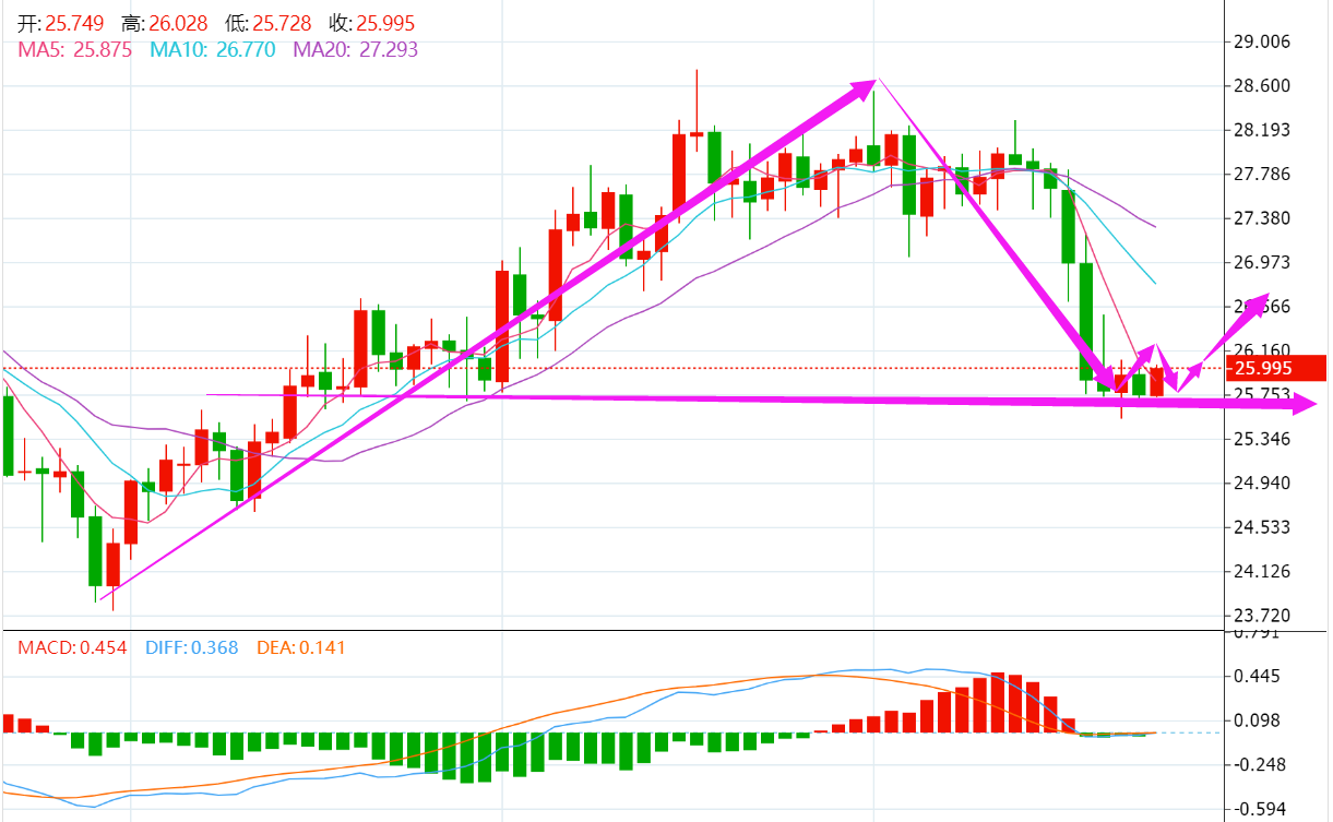 银价反弹受阻后加速回落,短线一度触及25.60新低点,午后重返26.00关口,目前维持25.80-26.00区间盘整,下行动能减弱迹象明显,技术面有超跌反弹走势,左侧盘整区间构成形态支撑,反弹走势将逐步展开,建议下行遇阻后逢低做多。 稳重者:入场位25.30-25.60,止损位24.90,止盈位26.30。 激进者:入场位25.50-25.90,止损位25.10,止盈位26.50。