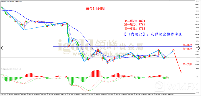 如黄金1H图所示,黄金盘中一度加速上涨,但最终未受阻于前高,随后再度重回震荡敬意。从均线指标来看,均线向下发散,MA30加速下行,下跌趋势确认。从MACD指标来看,DIFF线与DEA线近期在零轴附近反复穿越,无明显上行动能。结合4小时周期当前仍然在下跌趋势,预计延续下跌的概率较大,建议投资者可耐心等待反弹至此压力位附近轻仓试空。