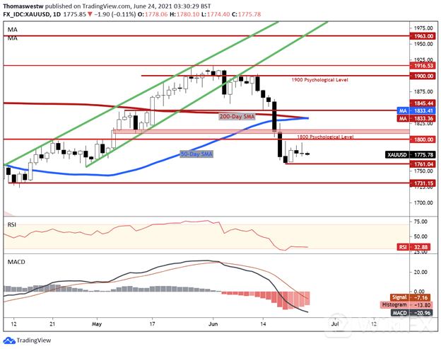 尽管金价大幅下跌,但黄金的技术走势看来将出现修正性走高。在50- 200日简单移动均线之间形成的看涨黄金交叉暗示上行势头可能很快出现。1800点的心理位是近期阻力位。或者,近期的波动低点1761.04可能为下行提供支撑区域。