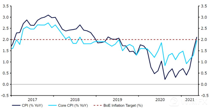 当然,英国央行面临的一个关键问题是近期英国通胀率的上升。随着政府逐步解除封锁措施,物价正以相当快的速度上涨。5月,英国总体消费价格增长率高于英国央行的目标(同比增长2.1%),即使是波动较小的核心通胀指标也跃升至2%,远高于1.5%的共识,也是自2018年8月以来的最高水平。