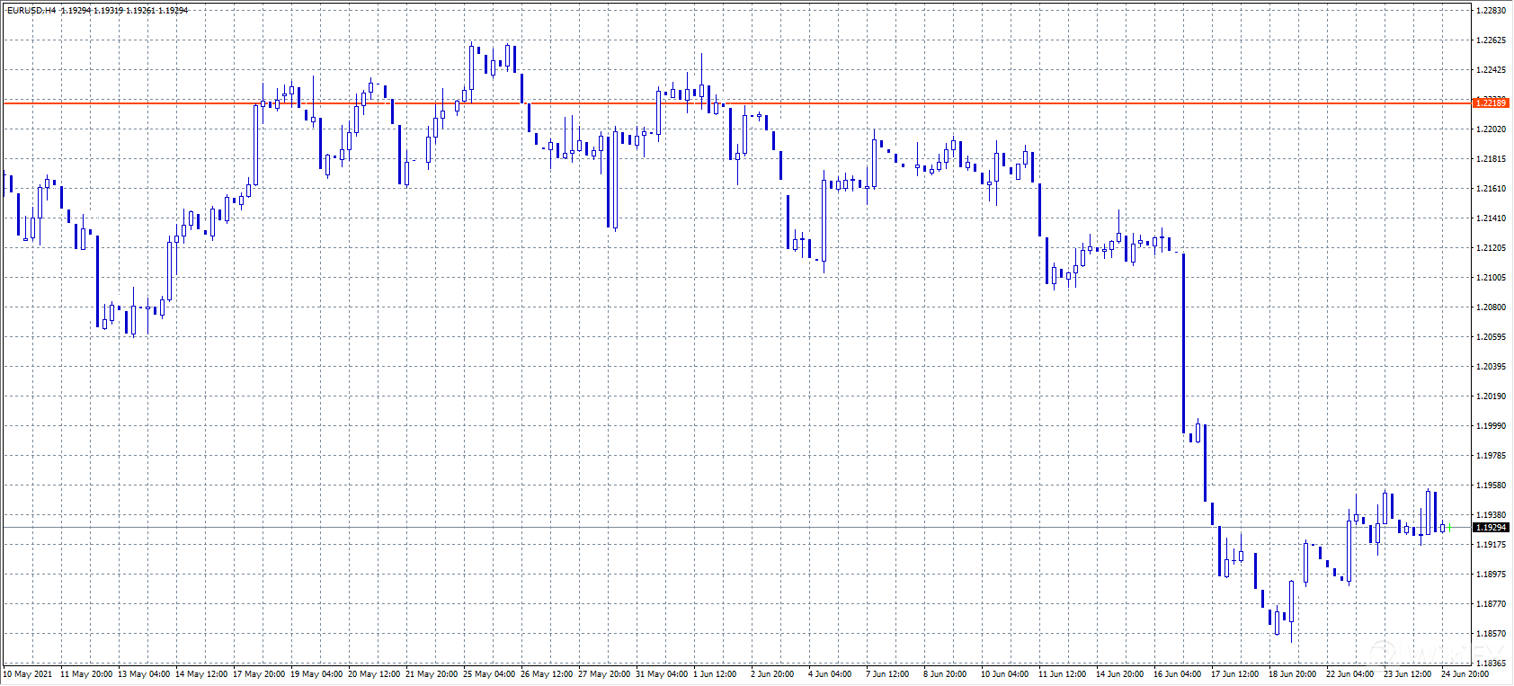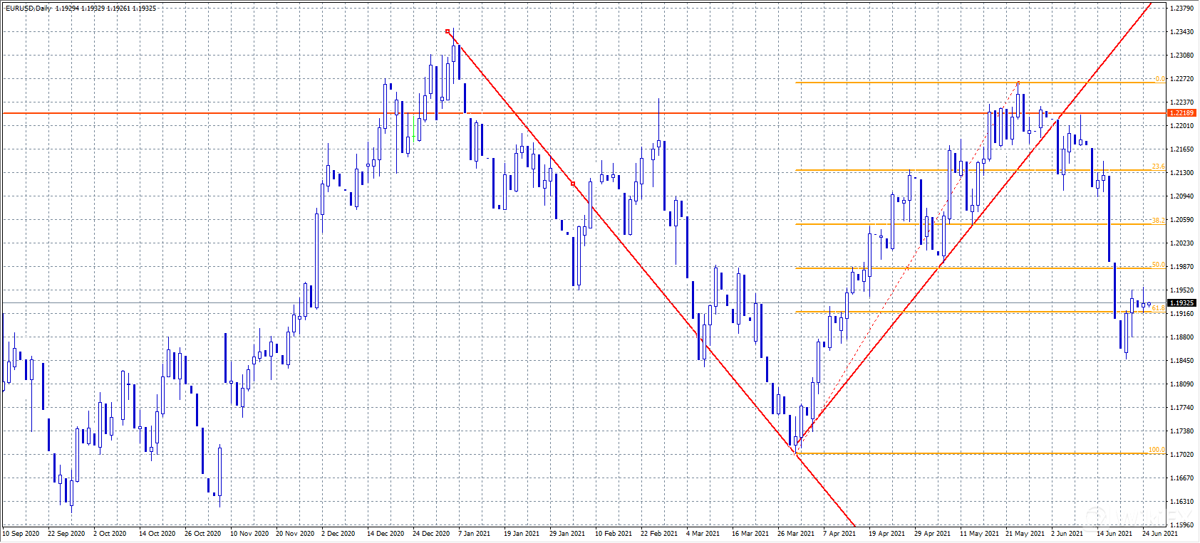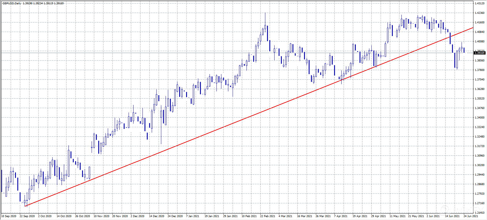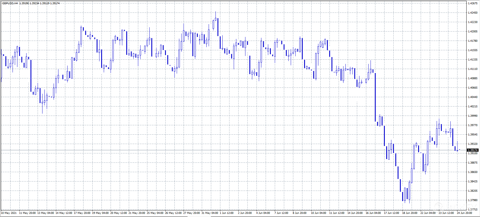 欧元/美元开盘小幅上涨,美国时段涨幅收窄,收于1.1930附近,市场普遍维持积极情绪,但美元仍上涨,原因是美国总统拜登已就基础设施支出计划达成了两党协议。此外,德国公布了6月IFO调查指数超过预期,升至2018年11月以来高位。若汇价上破1.1980,则有看涨机会。