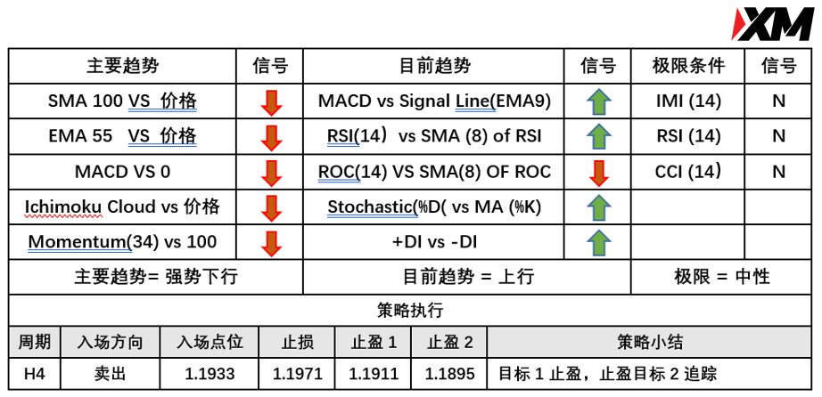 入场价位:1.1933,止损价位:1.1971,止盈目标一:1.1911,止盈目标二: 1.1895。