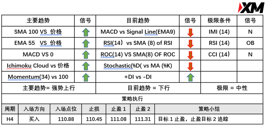 入场价位:110.88,止损价位:110.45,止盈目标一:111.08,止盈目标二: 111.31。