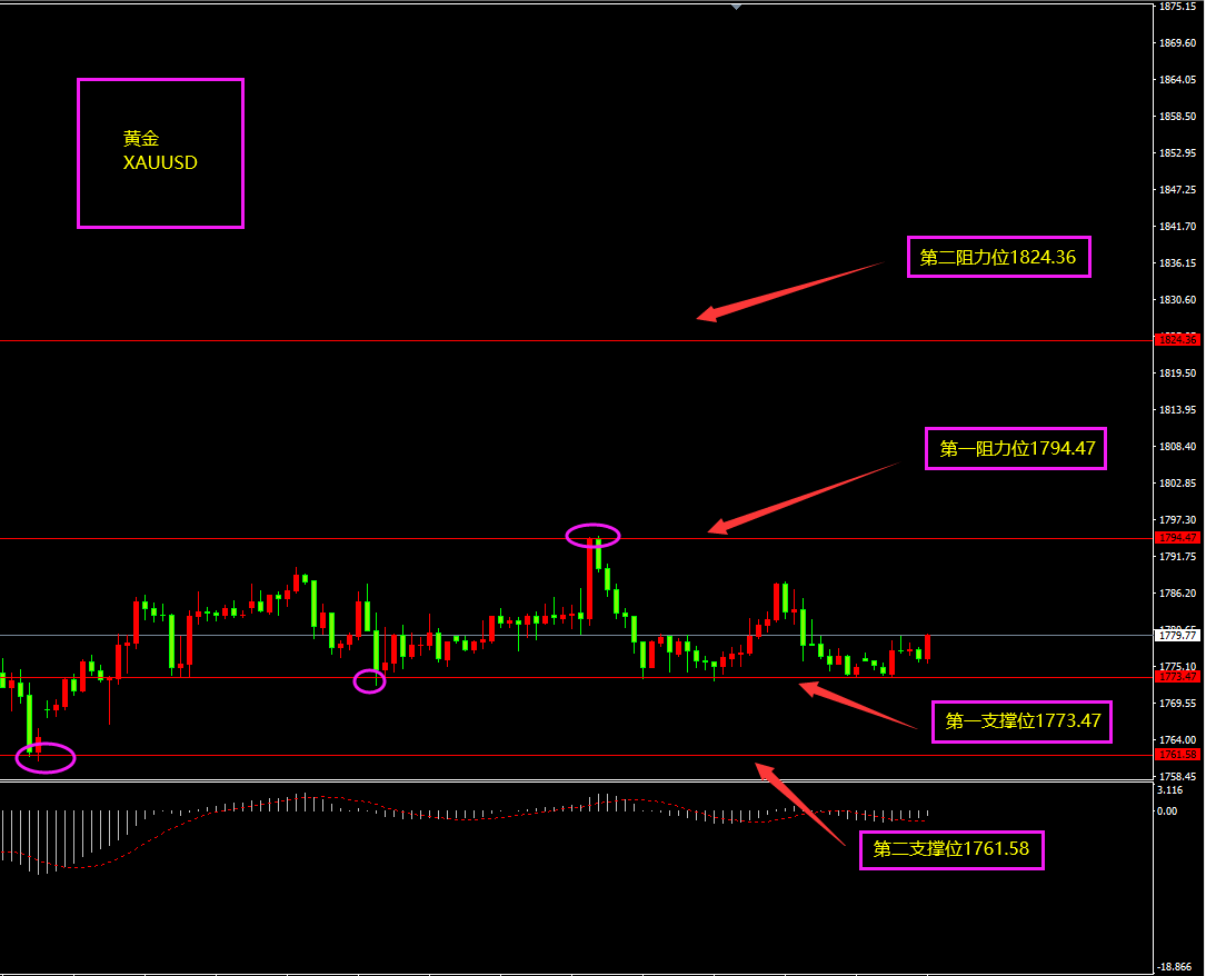 技术点评:天图黄金收小阴线,价格小幅回落,目前大方向已由多头转为空头,短期处在下降回调阶段,底部阳线不破,支撑仍在,日内更多以逢低看多为主?小时图黄金仍处在区间震荡(1761-1794),上方虽有连续阴线回落,但下方仍未以大阴线打破,多头仍在,日内更多以逢低看多为主(仍存在下行风险)?