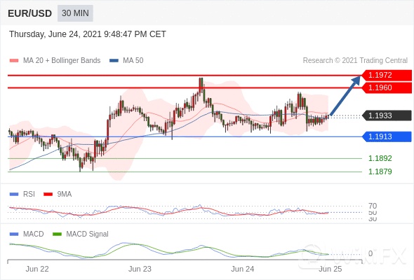 欧元/美元 当日内: 调整至 1.1913 处,在反弹上升之前。 1.1913 作为转折点。 交易策略:调整至 1.1913 处,在反弹上升之前。备选策略:如跌破 1.1913 ,EUR/USD 目标方向定在 1.1892 和 1.1879 。 技术点评 :RSI技术指标超过50。 MACD技术指标呈现看跌状态并 处在其信号线的下方。 另外,价位在其20天移动平均线以下 ( 1.1936 ) 但高于其50天移动平均线 ( 1.1931 )。