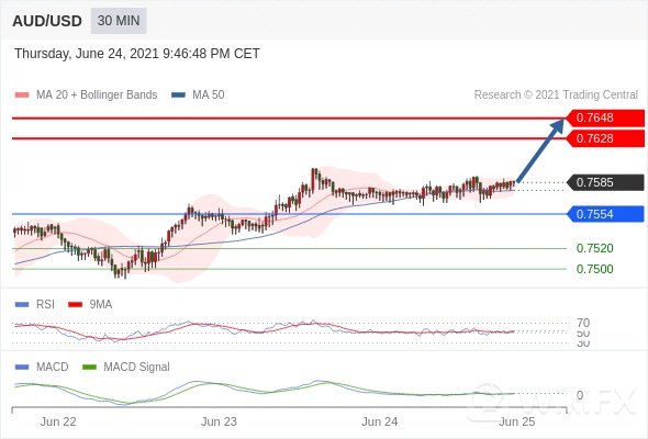 澳元/美元 当日内: 看涨,当 0.7554 为支撑位。 转折点定在:0.7554 交易策略:看涨,当 0.7554 为支撑位。备选策略:如跌破 0.7554 ,AUD/USD 目标方向定在 0.7520 和 0.7500 。 技术点评 :RSI技术指标超过50。 MACD技术指标处在其信号线之上 看多。 此外,价位高于其20天及50天移动平均线 ( 分别位于 0.7581 和 0.7577 )。