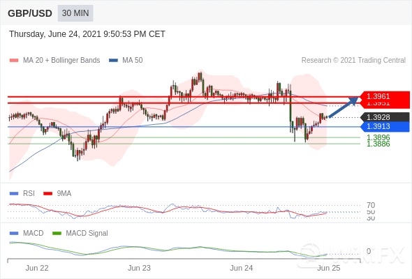 英镑/美元 当日内: 有上涨的可能,目标价位定在 1.3961 。 1.3913 作为转折点。 交易策略:有上涨的可能,目标价位定在 1.3961 。备选策略:向下跌破 1.3913 ,将带来继续下跌的趋势,目标位为 1.3896 然后为 1.3886 。 技术点评 :RSI技术指标低于50。 MACD技术指标呈现看跌状态并 处在其信号线的上方。 另外,价位低于其50天移动平均线 ( 1.3946 ) 但高于其20天移动平均线 ( 1.3923 )。