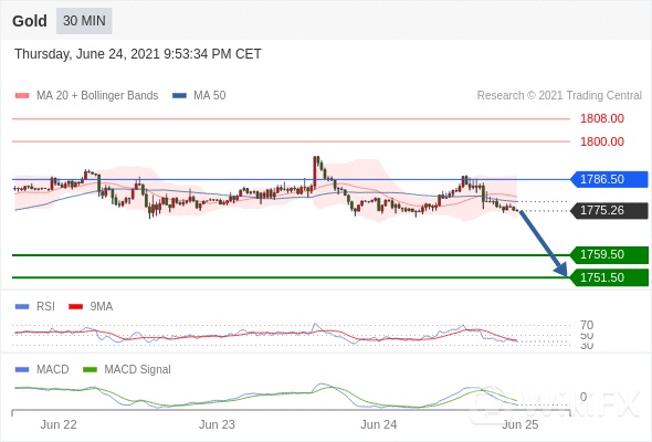 Gold 当日内: 看跌,在 1786.50 之下。转折点定在:1786.50 交易策略:看跌,在 1786.50 之下。 备选策略:如突破 1786.50 ,Gold 目标方向为 1800 和 1808 。 技术点评 :RSI技术指标低于50。 MACD技术指标处在其信号线之下 看空。 此外,价位处在其20个时期及50个时期移动平均线下方 ( 当前是 1780.25 和 1778.59 )。