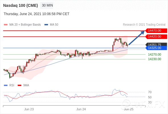 美国纳斯达克100指数期货 (U1)当日内: 上升空间有限。转折点:14325.00 交易策略:在 14325.00 之上,看涨,目标价位为 14420.00 ,然后为 14470.00 。 备选策略:在 14325.00 下,看空,目标价位定在 14270.00 ,然后为 14230.00。 技术点评:RSI技术指标运行趋势复杂,倾向于上涨。