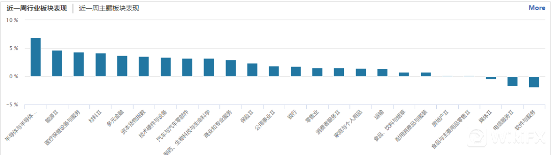 从行业板块表现来看,半导体、能源、医疗保健设备、材料、金融等涨幅居前,软件与服务、电信、媒体、食品、房地产等跌幅居前。