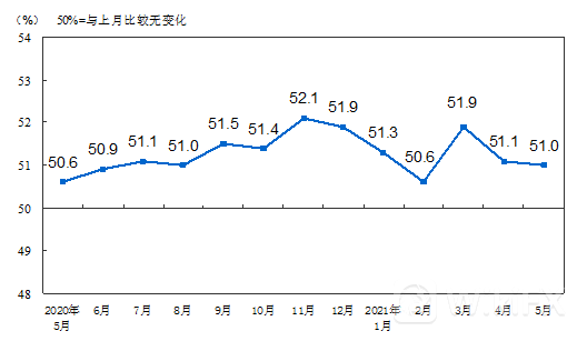 5月份,中国制造业采购经理指数(PMI)为51.0%,微低于上月0.1个百分点,继续位于临界点以上,制造业保持平稳扩张。