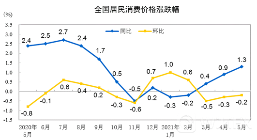 2021年5月份,全国居民消费价格同比上涨1.3%,环比下降0.2%。1—5月平均,全国居民消费价格比去年同期上涨0.4%。