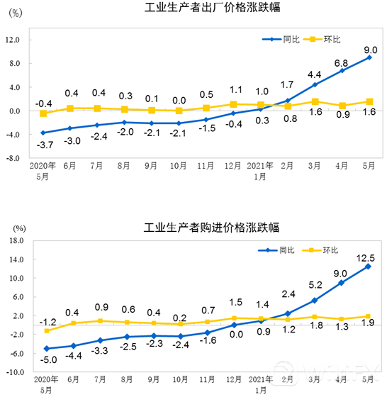2021年5月份,全国工业生产者出厂价格同比上涨9.0%,环比上涨1.6%;工业生产者购进价格同比上涨12.5%,环比上涨1.9%。1—5月平均,工业生产者出厂价格比去年同期上涨4.4%,工业生产者购进价格上涨5.9%。
