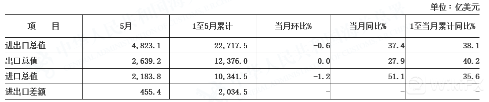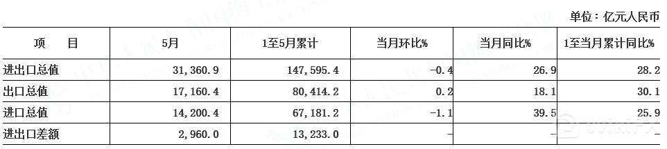 今年前5个月,我国外贸进出口14.76万亿元人民币,同比增长28.2%,月度进出口已连续1年呈现增长态势。以美元计价,中国5月出口同比增长27.9%,预期增长32.1%,前值增长32.3%。以美元计价,中国5月进口同比增长51.1%,前值增长43.1%;贸易顺差455.3亿美元,同比减少26.5%。以人民币计价,中国5月出口同比增长18.1%,预期增长19.5%,前值增长22.2%。中国5月进口同比增长39.5%,预期增长44.2%,前值增长32.2%;贸易顺差2960亿元,同比减少32.1%。