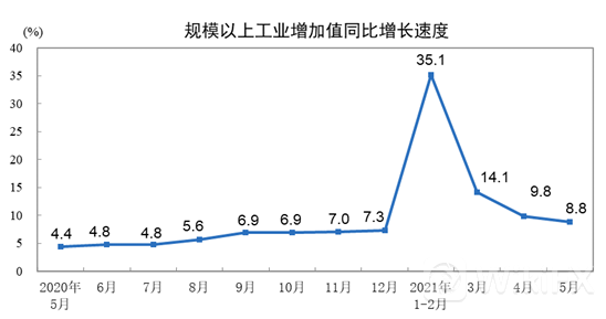 5月份,规模以上工业增加值同比实际增长8.8%(以下增加值增速均为扣除价格因素的实际增长率),比2019年同期增长13.6%,两年平均增长6.6%。从环比看,5月份,规模以上工业增加值比上月增长0.52%。1—5月份,规模以上工业增加值同比增长17.8%,两年平均增长7.0%。