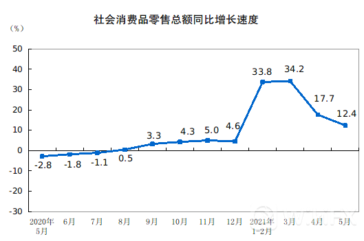 5月份,社会消费品零售总额35945亿元,同比增长12.4%;比2019年5月份增长9.3%,两年平均增速为4.5%。1—5月份,社会消费品零售总额174319亿元,同比增长25.7%,两年平均增速为4.3%。其中,除汽车以外的消费品零售额156304亿元,增长24.4%。