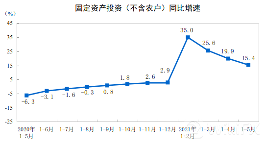 1—5月份,全国固定资产投资(不含农户)193917亿元,同比增长15.4%;比2019年1—5月份增长8.5%,两年平均增长4.2%。其中,民间固定资产投资112472亿元,同比增长18.1%。从环比看,5月份固定资产投资(不含农户)增长0.17%。