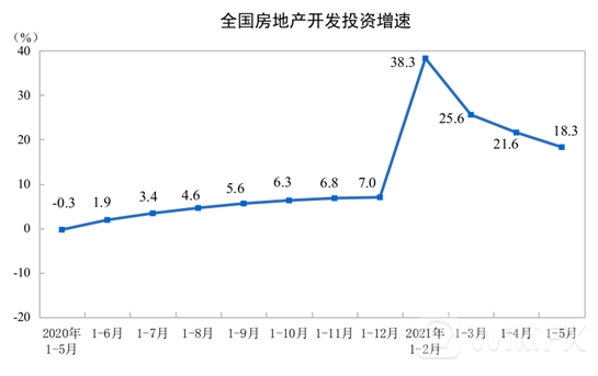 1—5月份,全国房地产开发投资54318亿元,同比增长18.3%;比2019年1—5月份增长17.9%,两年平均增长8.6%。其中,住宅投资40750亿元,增长20.7%。