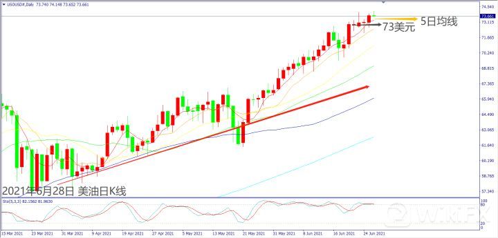 日级别线图,短线在73美元附近震荡,若守住5日均线,可能挑战波段新高。