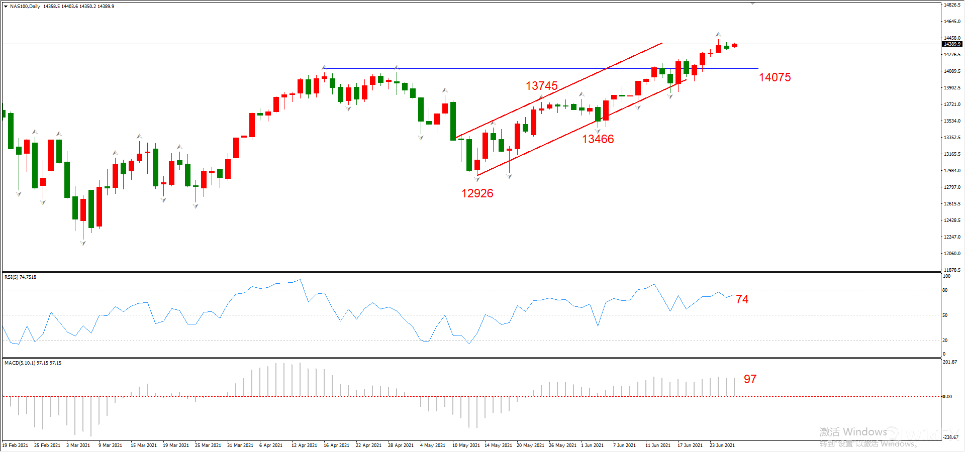 综合判断:14075阻力位已经被有效突破,上方空间较大,预计将维持涨势。宏观面来看,短期受到1.2万亿基建计划利多推动;长期来看,美联储缩加息预期必将对美股造成持续性打压,未来长线开启较大幅度下跌是大概率事件。
