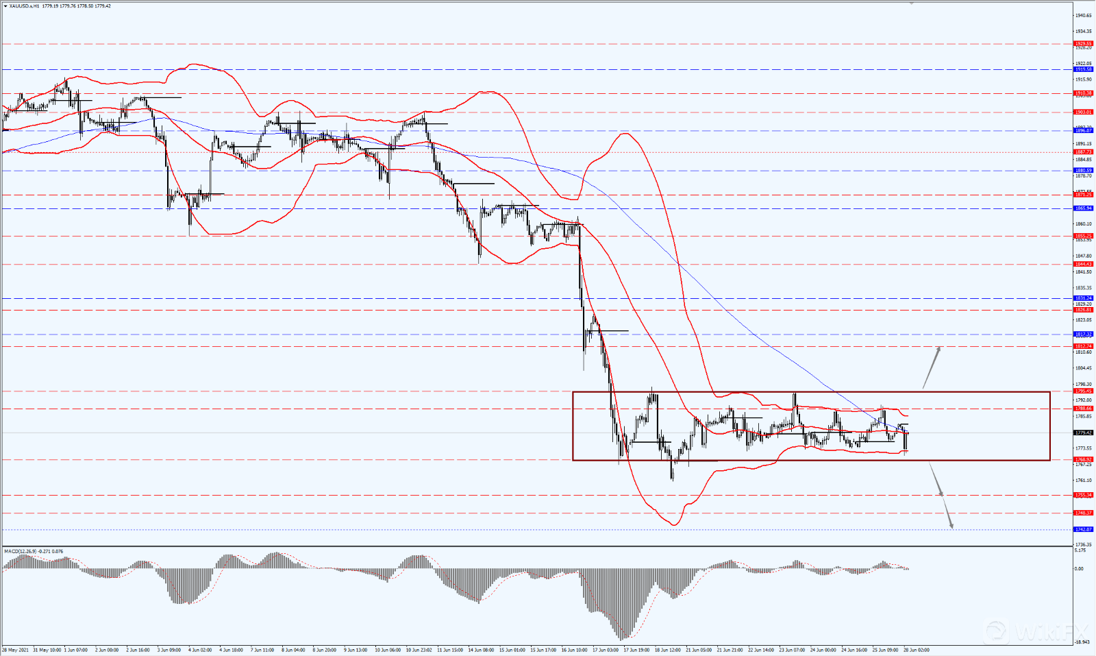 昨日金价依旧在区间内震荡整理,今日,金价关注上方1788和1795两个位置,如果金价能够站上1788那么向上突破1795的概率就会加大,只有上破了1795,届时金价将打开进一步的上行空间;下方依旧关注1768一线,只有力度跌破该位置才能打开进一步的下行空间。