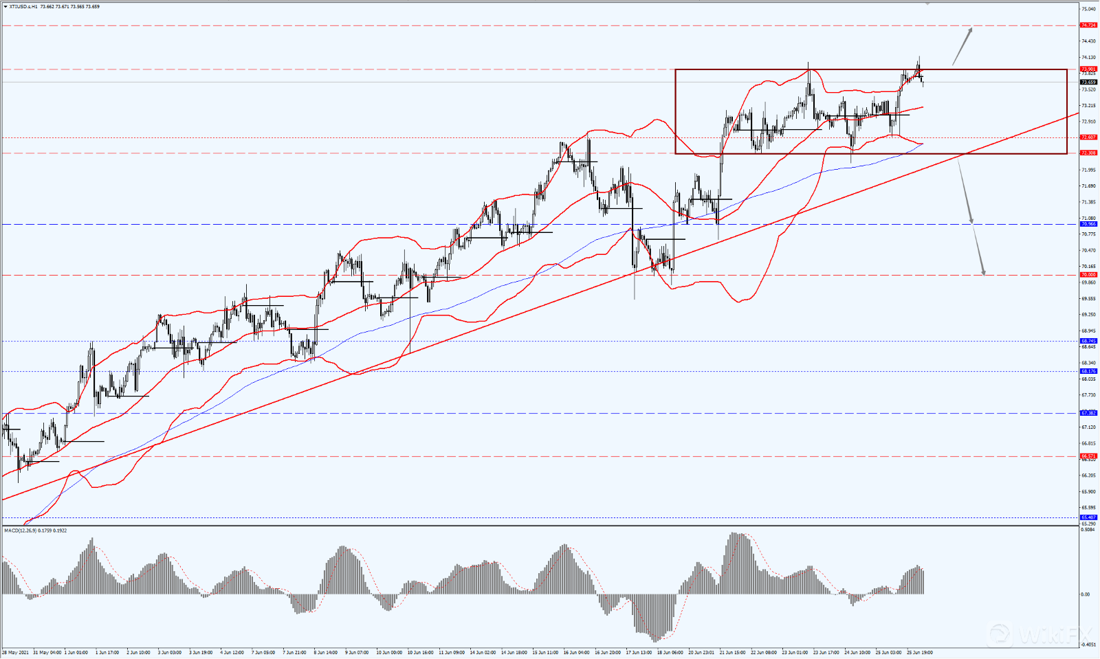 亚洲时段,美原油小幅上涨,目前徘徊于74.30附近。油价上周五(25日)攀升至2018年10月以来最高,两大指标原油连续第五周上涨。由于预期需求增长将超过供应,且石油输出国组织及其盟国组成的OPEC+将谨慎地从8月开始向市场提供更多原油。