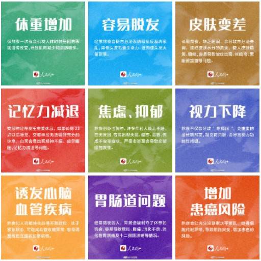 近日,#90后姑娘熬夜10年长出老年斑#的话题登上了微博热搜第一!紧接着,“长期熬夜都有哪些危害”的话题霸榜。据人民网报道,长期熬夜会造成记忆力减退、皮肤变差、体重增加、视力下降、胃肠道问题等等。不少网友看后纷纷表示,以后再也不熬夜了!
