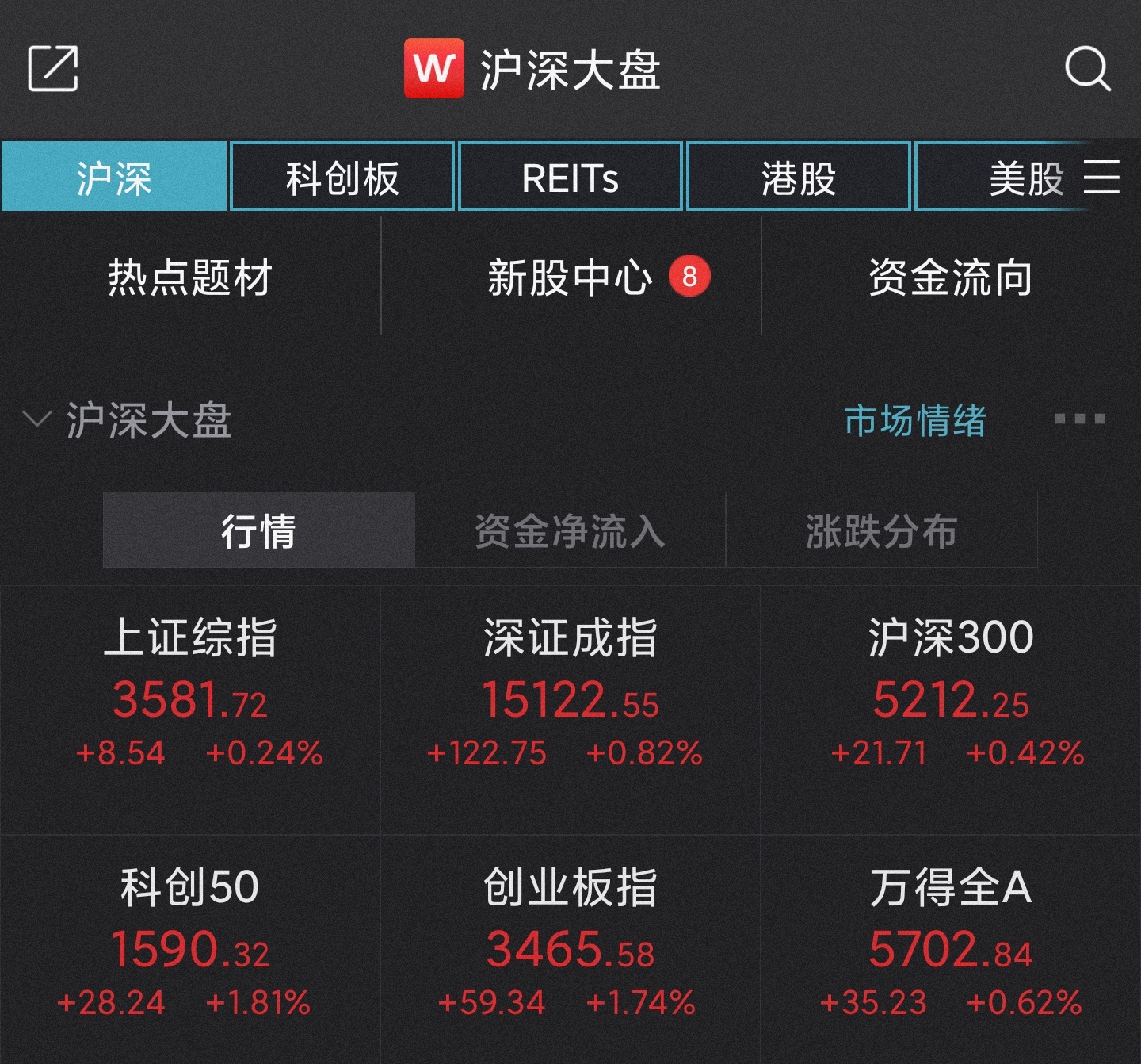 截至午间收盘,沪指报3581.72点,涨幅0.24%,成交额2556.85亿元;深成指报15122.55点,涨幅0.82%,成交额3227.38亿元;创业板指涨幅1.74%,报3465.58点,逼近年内高点3476点;上证50指数报3491.39点,涨幅0.25%。