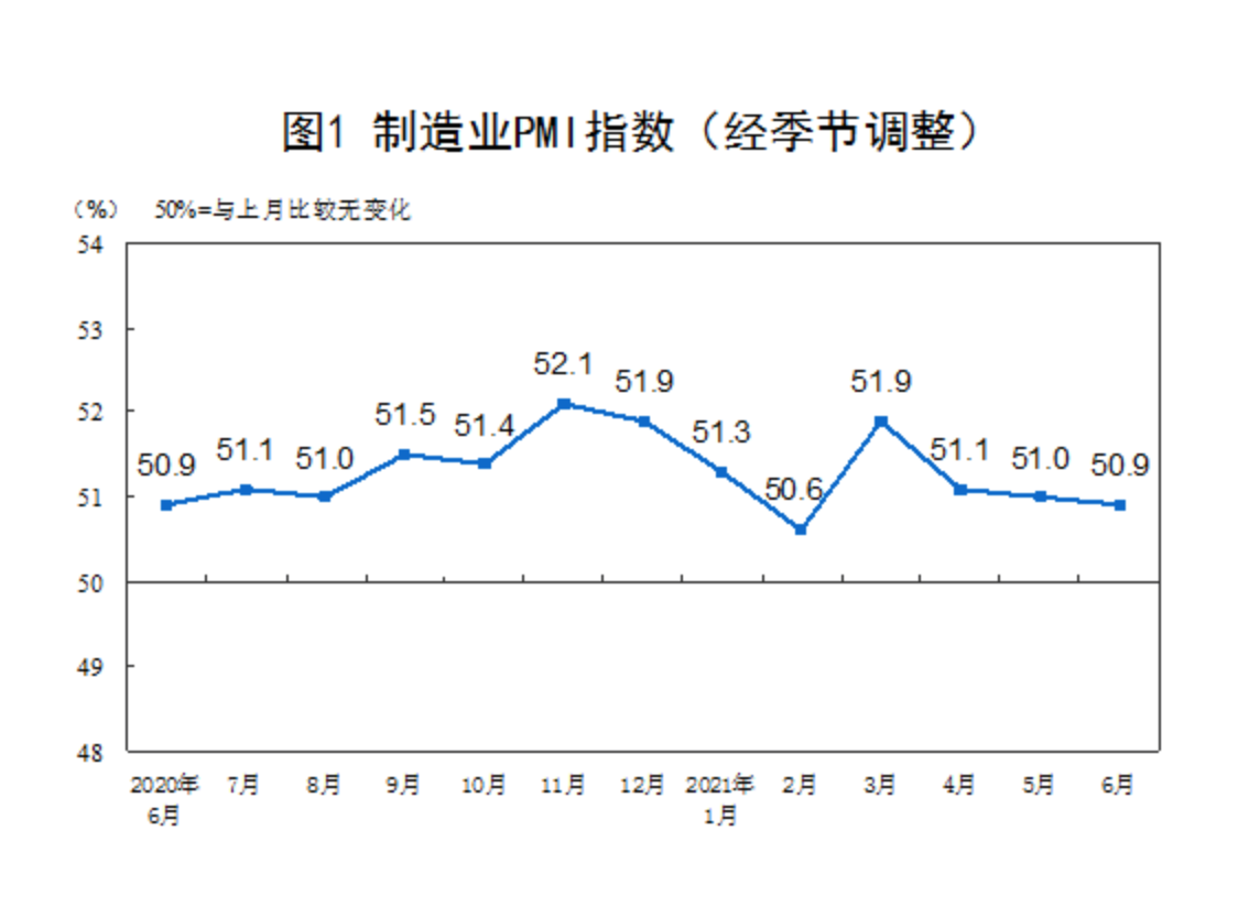 国家统计局服务业调查中心、中国物流与采购联合会30日发布数据,6月份,中国制造业采购经理指数(PMI)为50.9%,较上月微落0.1个百分点,继续位于临界点以上,制造业延续稳定扩张态势。