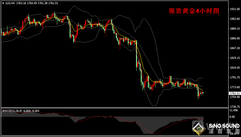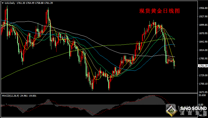 昨晚美盘时段初美元和美债强劲拉升,压制现货黄金直线下跌,金价自1775美元快速下跌并跌破重要支撑位1765以美元,金价下跌约25美元最低至1750.82美元/盎司,凌晨后金价反弹回到1760整数关口附近振荡,昨晚美盘金价最终收盘在1760.94美元/盎司,昨日金价下跌约1%。