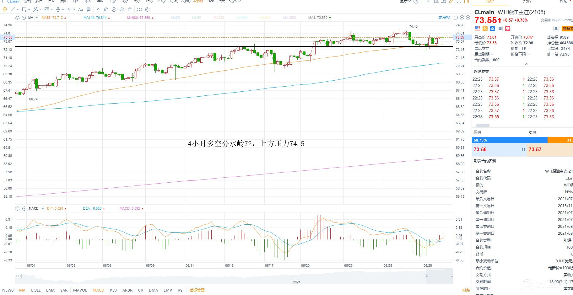 美原油维持高位震荡,关注今晚EIA数据的情况,注意,再供需层面若供给端增长,则不排除打压油价的可能性,因短期的需求要继续观察数据,所以供给增长则不利油价继续上行,技术层面进入了密集压力区间,74美元至76美元区间很难突破,谨防高位箱体震荡,下方多空分水岭72美元,跌破则有见顶风险,日内压力看74.5突破则加速上行