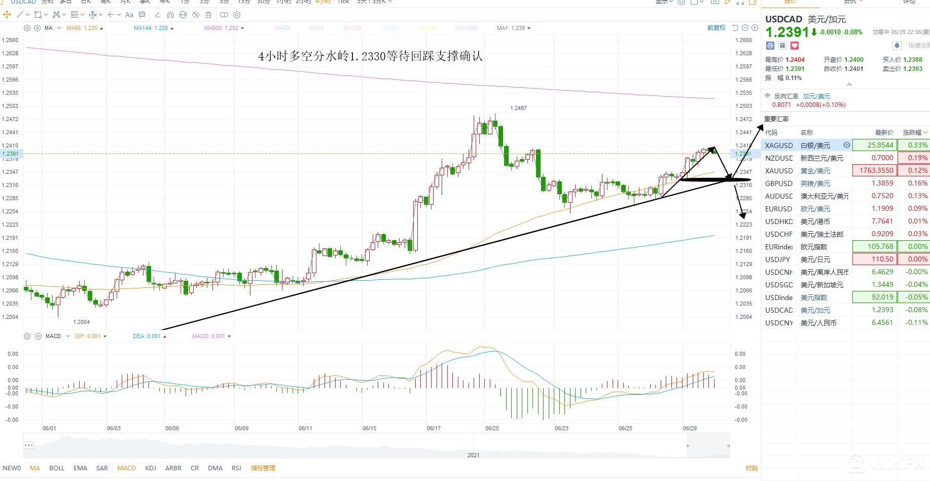 美加继续反弹,跟随美元走强,不过要注意的是这里的反弹暂时没有创出新高,因此结构上依然维持反弹结构,而并非反转结构,日内需要注意,4小时级别多空分水岭1.2330不破则维持反弹结构,上方突破前高1.2500附近,短期很难突破,等待回踩支撑确认