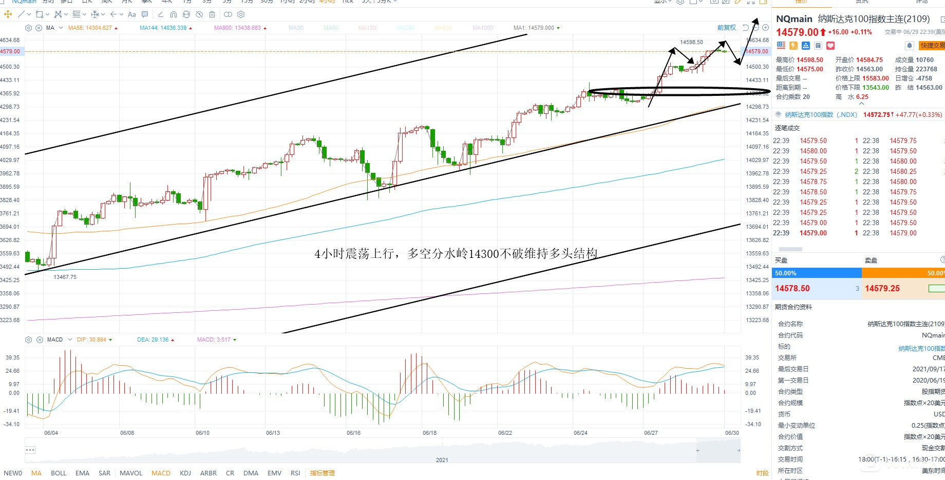 纳斯达克指数继续新高,短期市场风险偏好依然是居高不下,所以就算短期需要调整,那么也是要等待非农数据的推动,日内而言,4小时维持上涨趋势,此前水平位置突破之后14300成为多空分水岭,若再次跌破14300则突破失败,存在调整的风险,等待回踩支撑确认是否有效,不破14300则继续向上加速