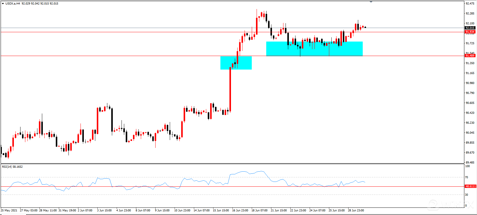 由上图4小时级别可以看出,美元指数形成了新的支撑位:91.935上下。美元可能会先试探该位置强度,然后再次选择短线方向。