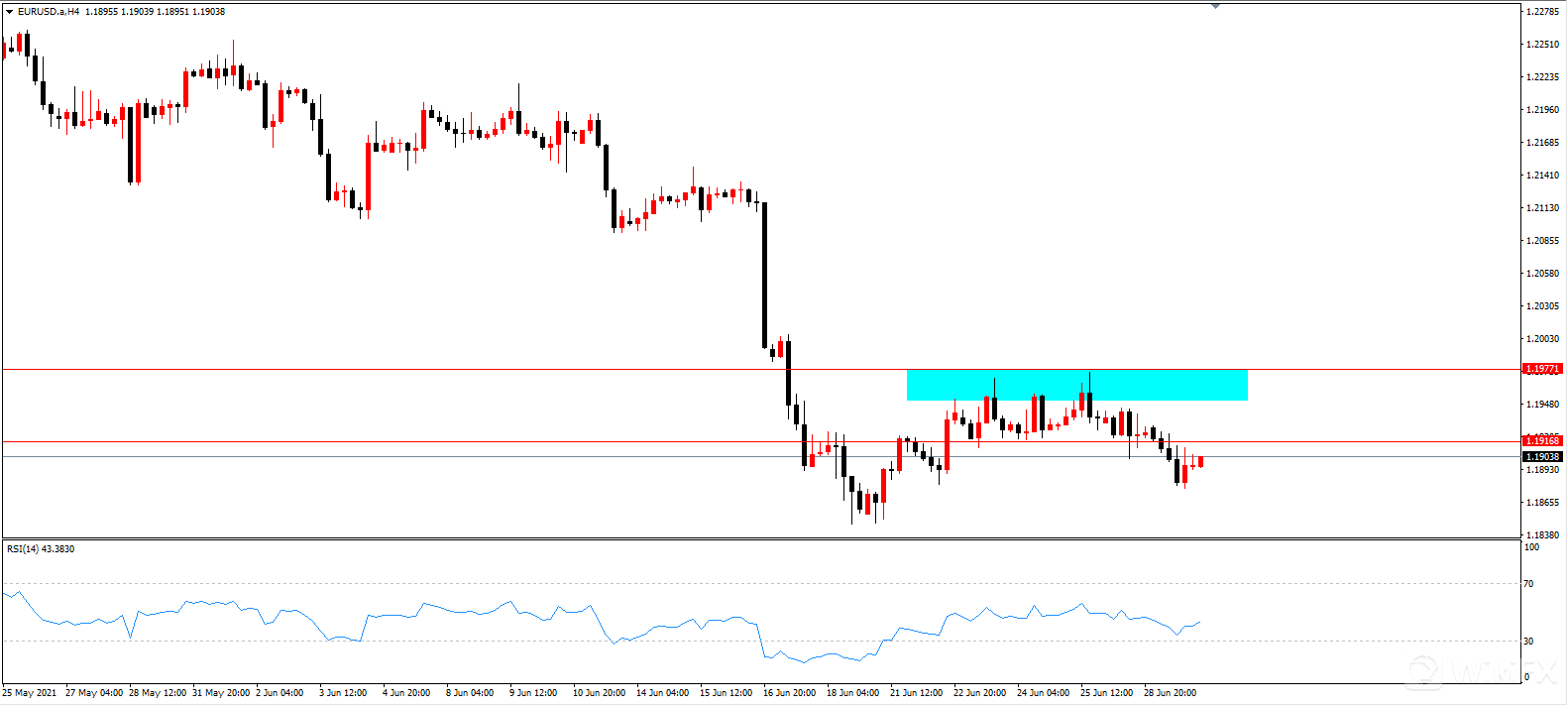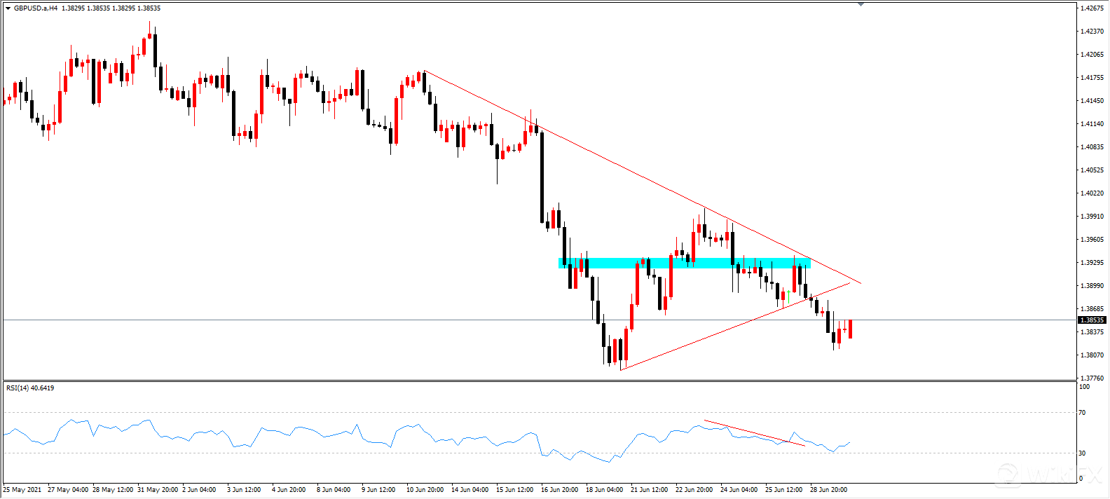 H4级别中,镑美走出了三角形形态,然后价格下破三角形下轨,形成了日线新低。