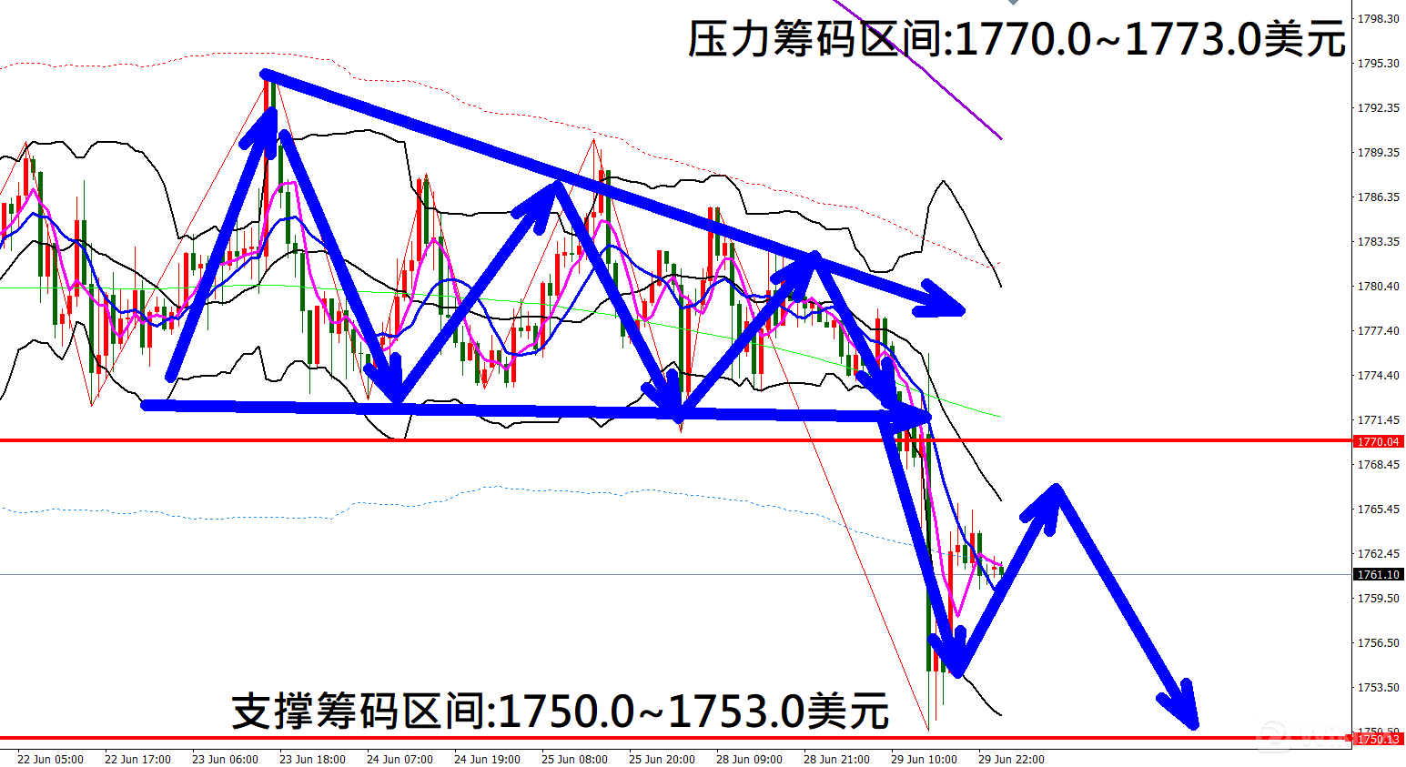 今日黄金(6月30日)早盘在1761.4美元/盎司附近,从技术分析面切入1小时级别观察走势架构符合昨日(29日)预测K棒出现大幅下跌行情,目前K棒落在布林通道中轨与下轨之间,同时开口转折朝下扩张,因此有机会反弹遇压后再度向下修正。