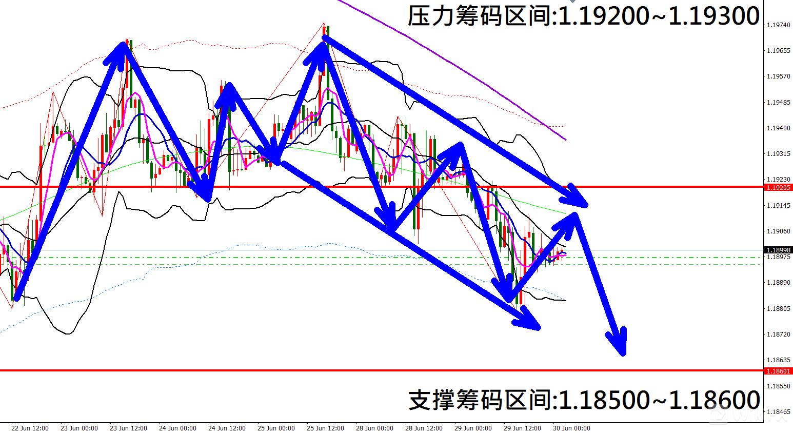 今日欧元/美元(6月30日)早盘在1.18965附近,从技术分析面切入,1小时级别观察走势架构符合昨日(29日)预测K棒反弹遇压后再度大幅向下修正,目前K棒落在布林通道中轨下方震荡,同时开口持续朝下扩张,因此有机会反弹遇压后再度向下修正。