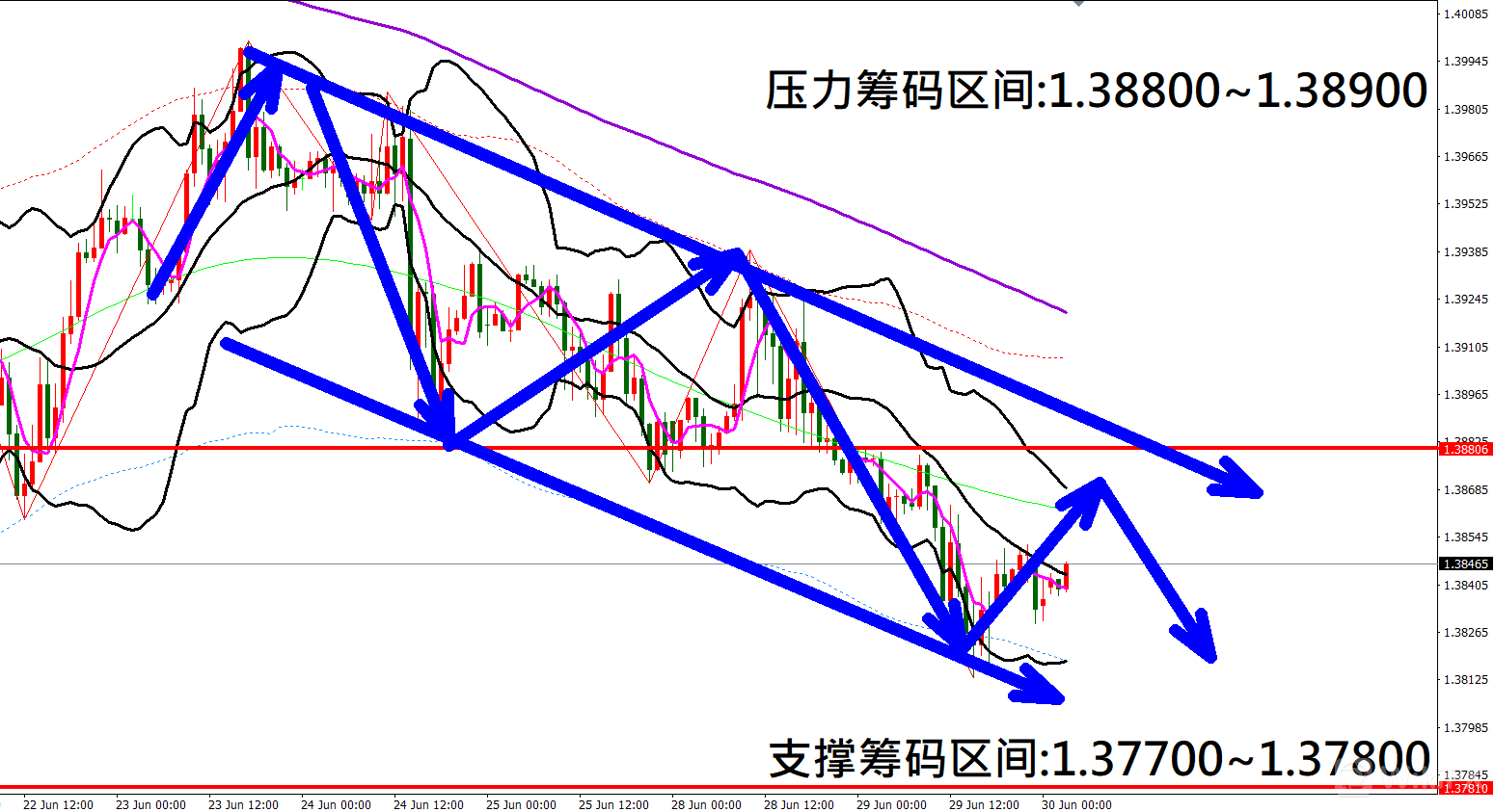 今日英镑/美元(6月30日)早盘在1.38398附近,从技术分析面切入,1小时线级别观察走势符合昨日(29日)预测K棒反弹遇压后再度大幅向下修正,目前K棒落在布林通道中轨与下轨之间,同时开口持续朝下扩张,因此有机会持续向下修正。