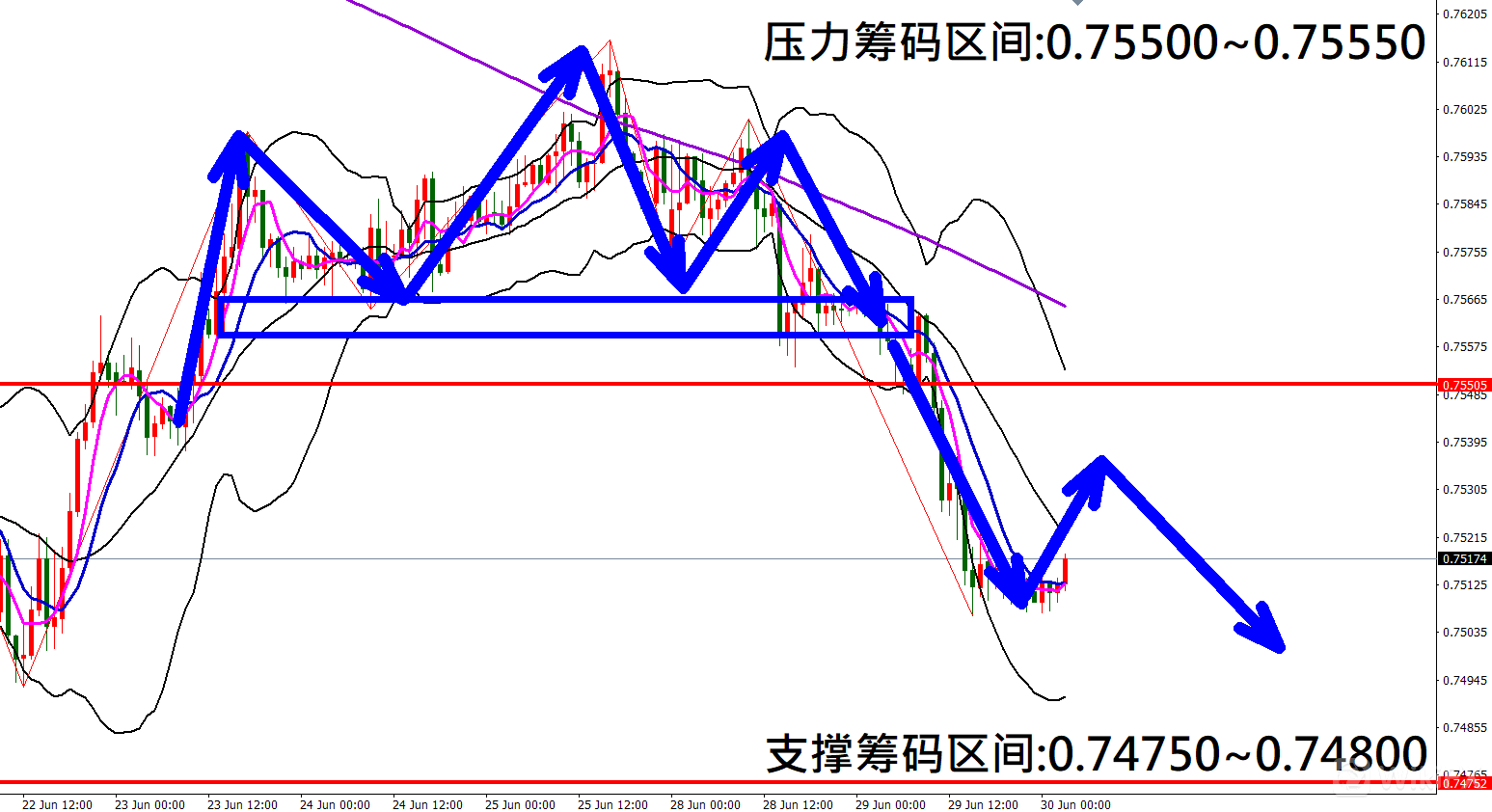 今日澳元/美元(6月30日)早盘在0.75128附近,从技术分析面切入,1小时线级别观察走势架构符合昨日(29日)预测K棒反弹遇压后再度拉回修正,目前K棒落在布林通道中轨下方震荡,同时开口转折朝下,因此有机会反弹遇压后出现拉回修正行情。
